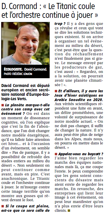 On est dans est dans un moment de dissonance cognitive, où l’on explique que c’est la fin de l’abondance, que l’on doit changer notre modèle énergétique, qu’il va falloir faire attention cet hiver… et à l’occasion d’un événement, on semble dire « Pas de panique, il y a possibilité de refroidir des stades entiers au milieu du désert ». Non seulement on peut continuer comme avant, mais en pire. C’est anachronique. Le Titanic coule et l’orchestre continue à jouer. Je m’insurge contre cette image terrible qu’on montre aux gosses qui rêvent devant le foot.